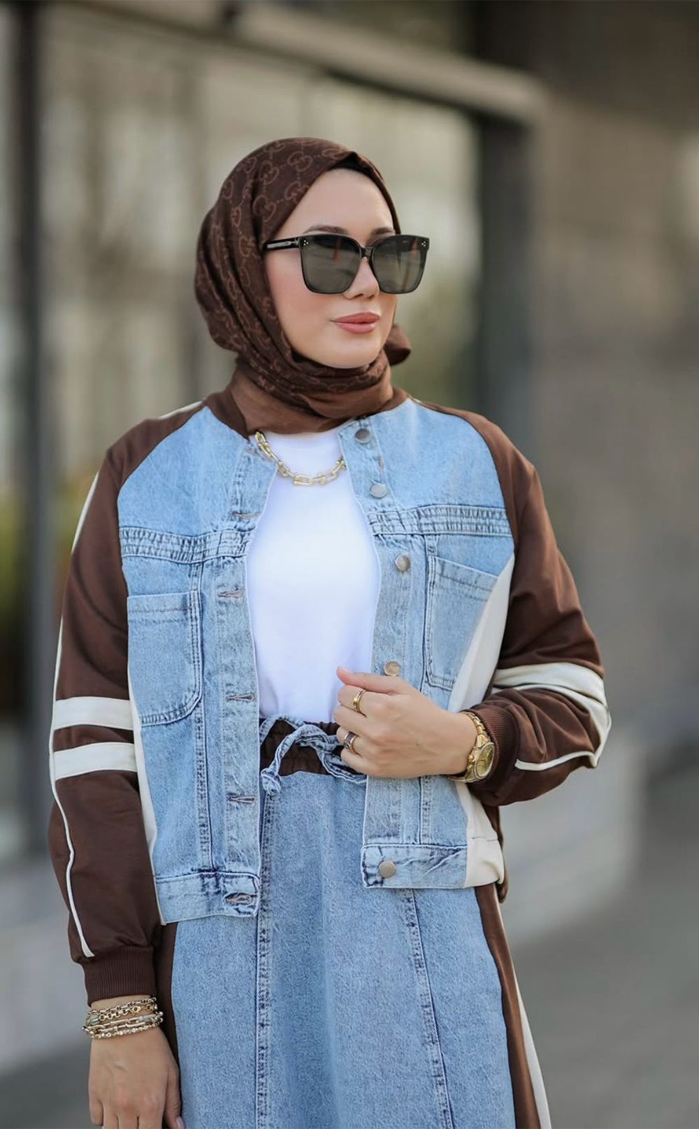Kahverengi Detaylı Denim Etekli Takım Kadın