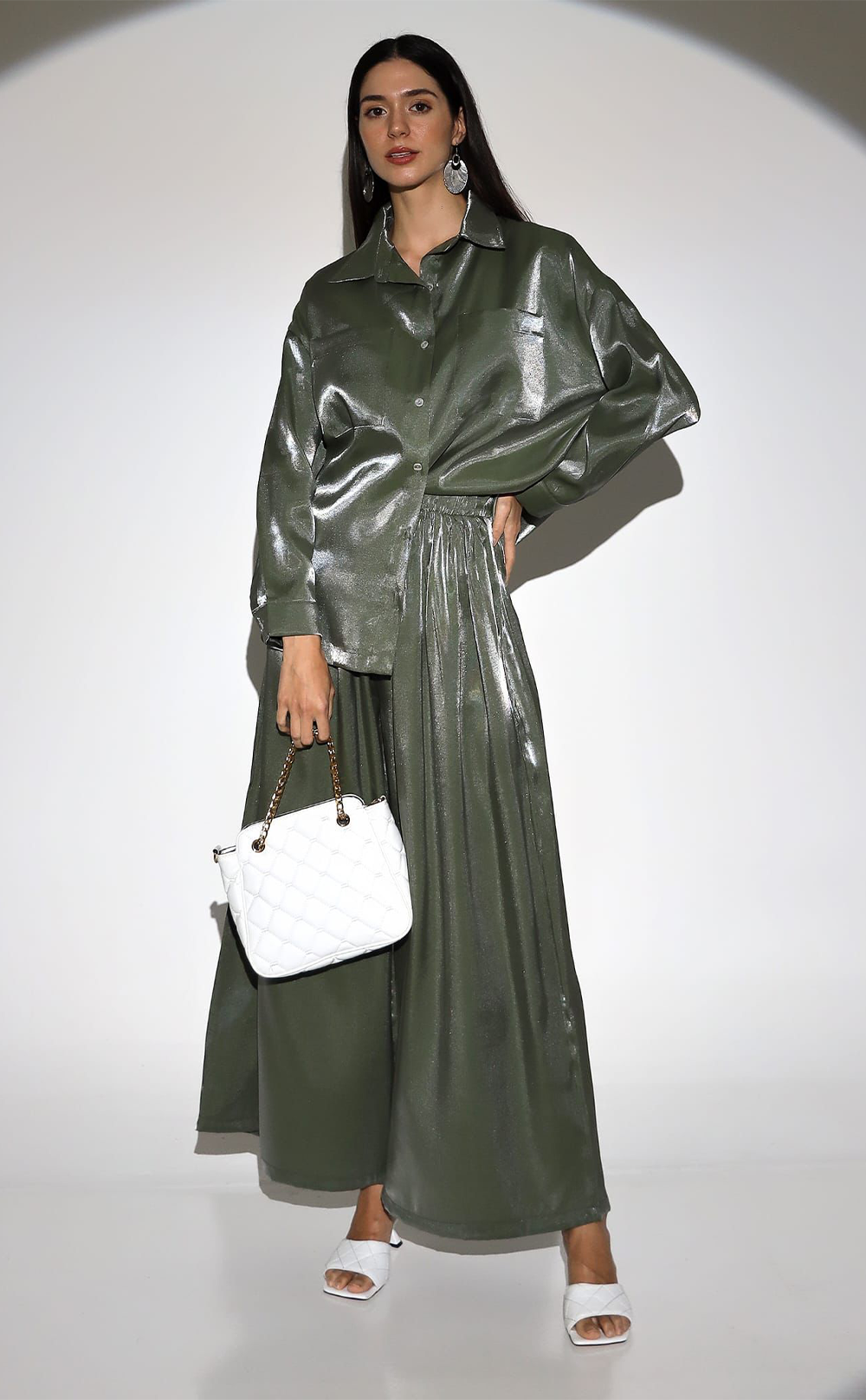 Parlak dokusu sayesinde ışıltılı ve şık bir görünüm sunan bu iki parçalı takım, özel davetlerden akşam yemeklerine kadar her anınıza uyum sağlar. Hafif esnek kumaşıyla gün boyu konfor sunarken, modern kesimiyle vücuda zarifçe oturur. Takım şıklığını tek adımda yakalamak isteyenler için ideal bir seçim!